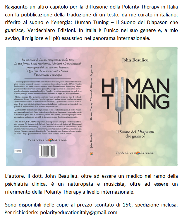 Polarity Therapy rappresenta per me un sistema organizzato dove tutto trova un ordine, è un metodo evoluto inclusivo sia degli aspetti grossolani sia di quelli più sottili della nostra dimensione umana.